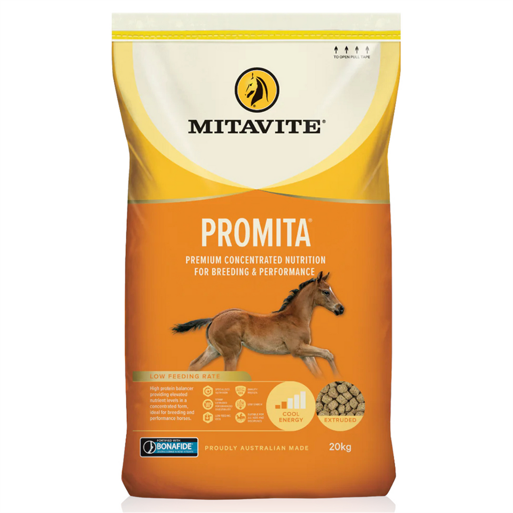 With its high protein content and fortified formulation, MITAVITE® PROMITA® supports healthy growth and development in young horses, aids in milk production for breeding mares and promotes muscle development through all life stages. Ensure your breeding and performance programs achieve the best possible outcomes with PROMITA®.