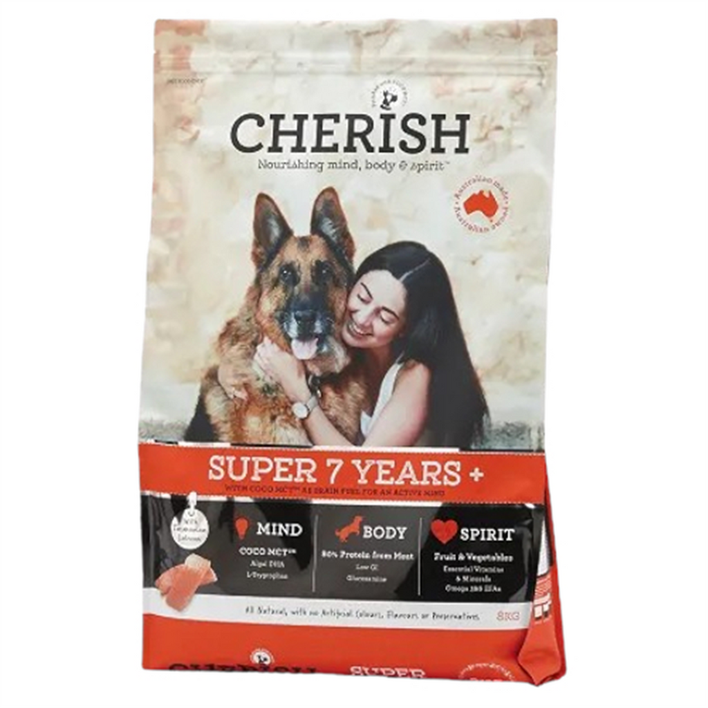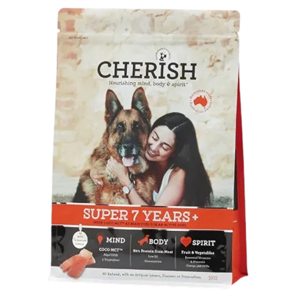 As your faithful friend ages, prevention is better than cure. To sustain mental alertness and cognitive health, Cherish Super 7 Years + has a specific and unique combination of marine DHA and plant-based essential fatty acids. As joints age and activity slows down, weight management is a priority. Our formulation includes glucosamine to support healthy cartilage and 80% lean quality protein from meat. To ensure your cherished companion always feels like a puppy at heart, we have a trio of ancient grains to provide low GI sustained energy. In addition we have carefully and scientifically selected a combination of antioxidant rich superfoods.
