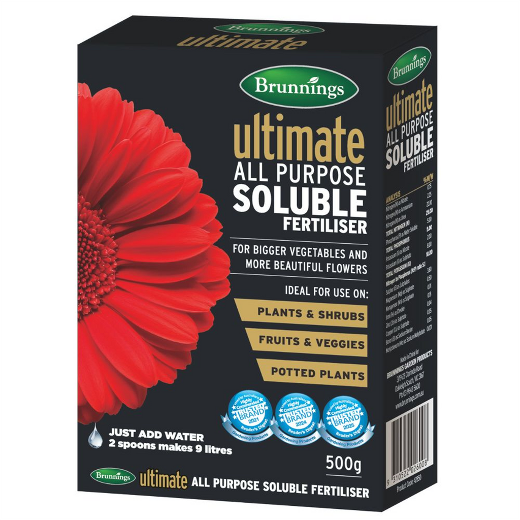 Brunnings ???????????????? All Purpose Soluble Fertiliser is a concentrated water soluble plant food which delivers the nutrients required for fast, strong and beautifully healthy growth. Because it feeds through the leaves and roots as you water, it works quickly and 2 spoons goes a long way.